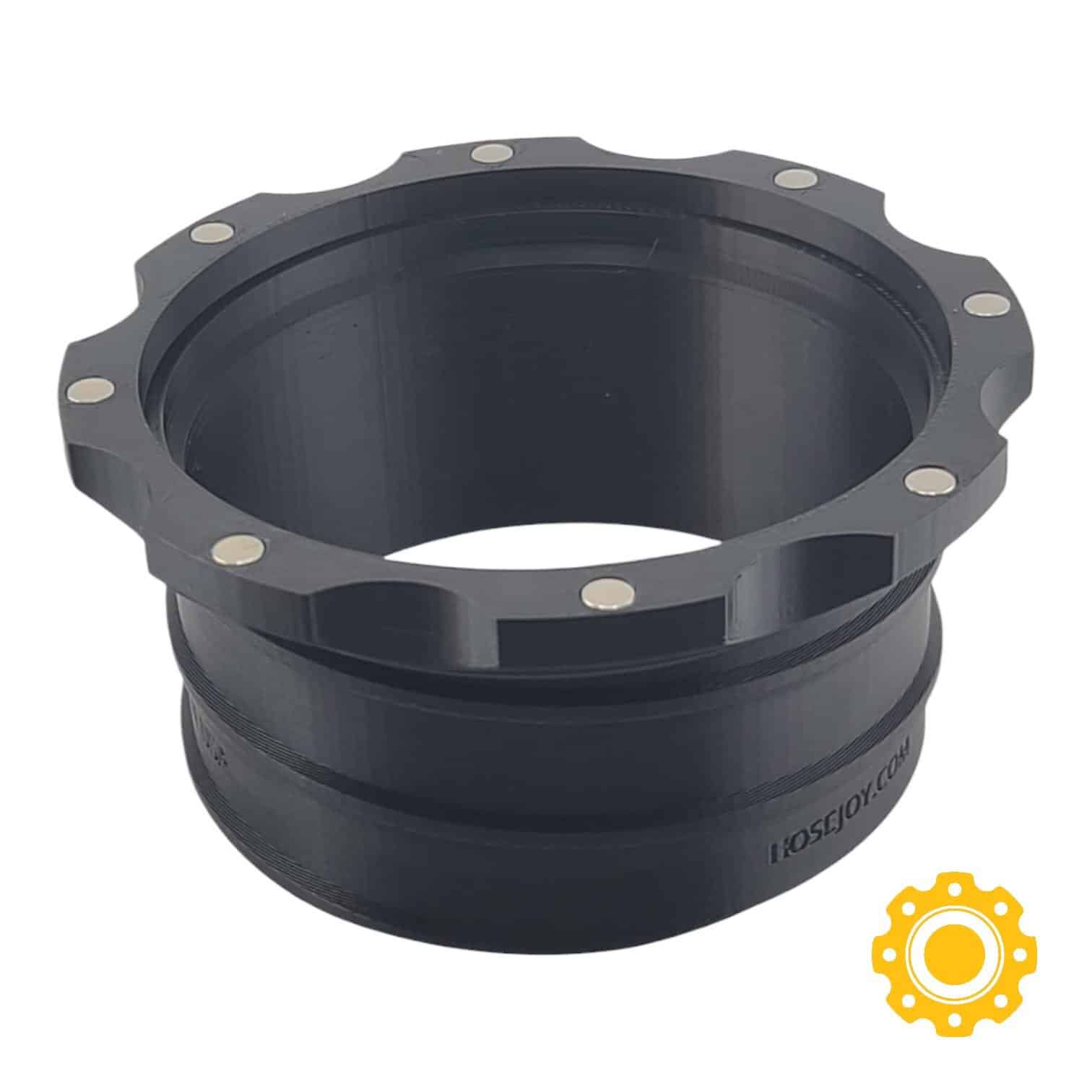 This magnetic 4 inch flex hose adapter is part of the HoseJoy magnetic hose connector system, providing a fast, frustration-free way to connect 4″ flex hose to tools without clamps, tabs, or hard-to-press fittings.