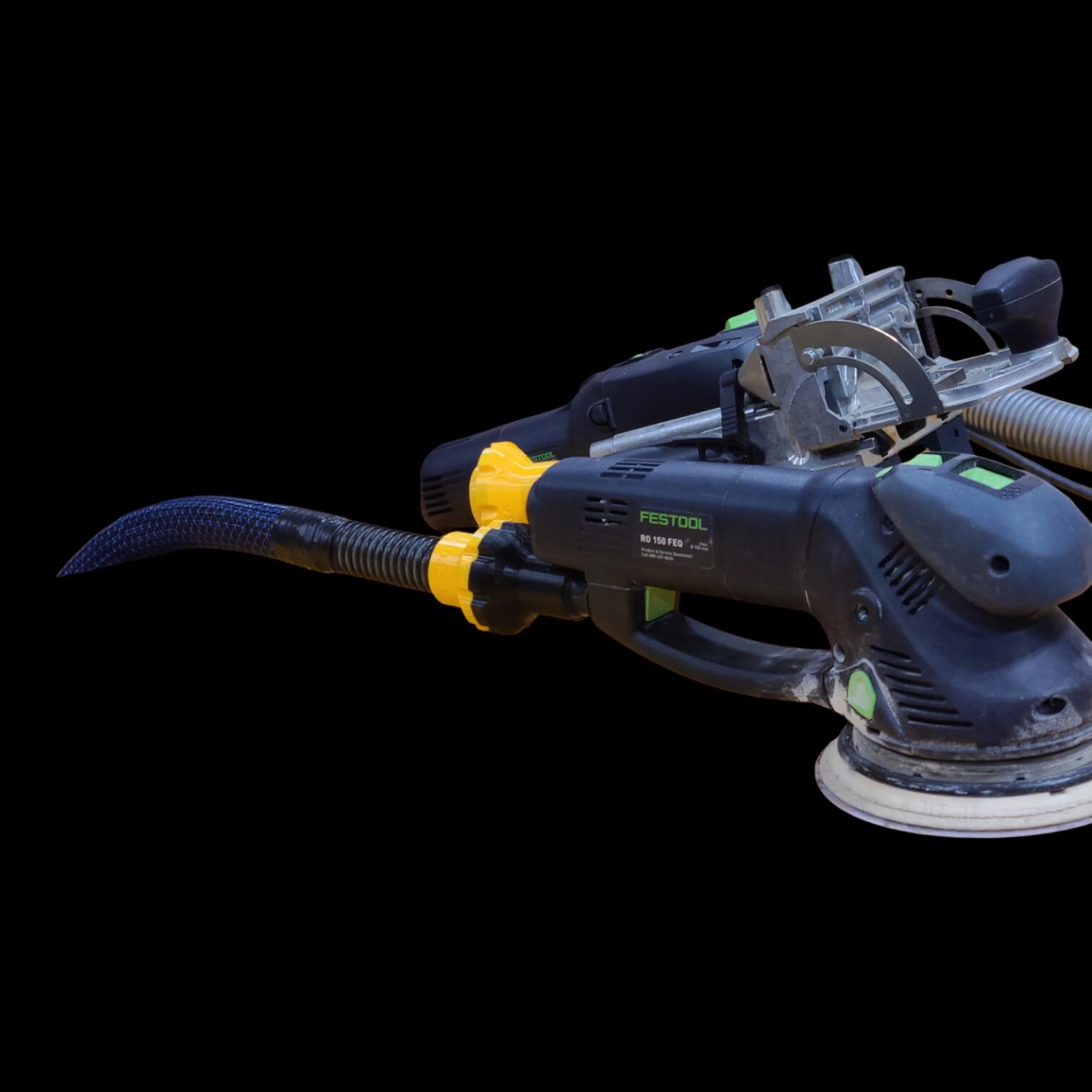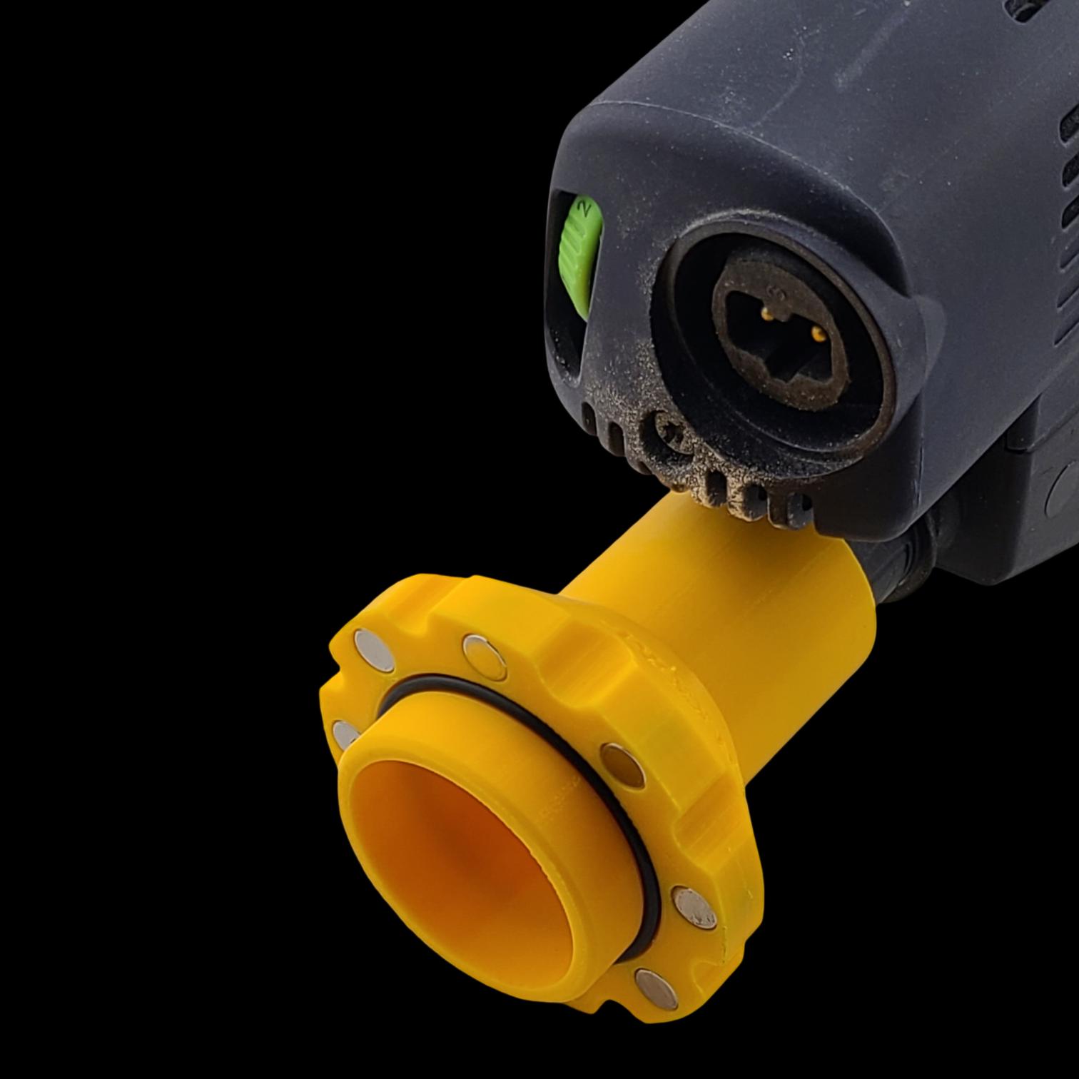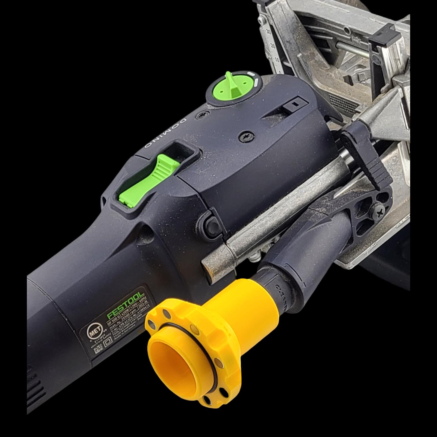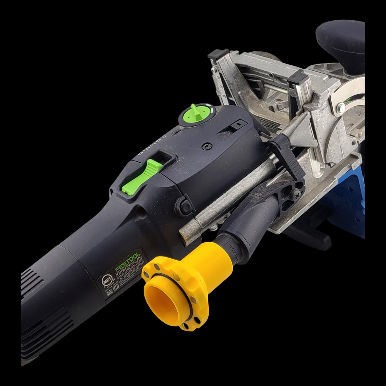 • This specific adapter works on any Festool tool with the 27mm bayonet, and it works by pressing and then rotating, locking the adapter in place and sealing it against the flange on the tool port